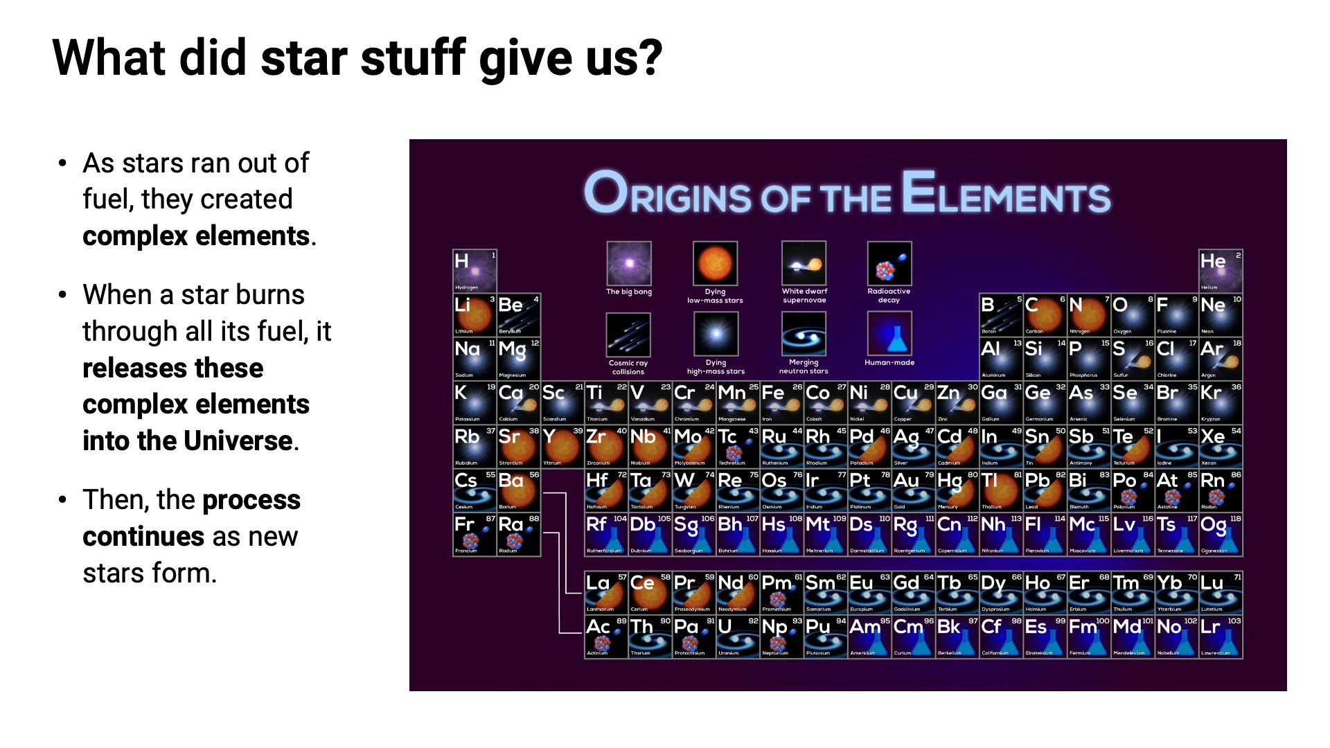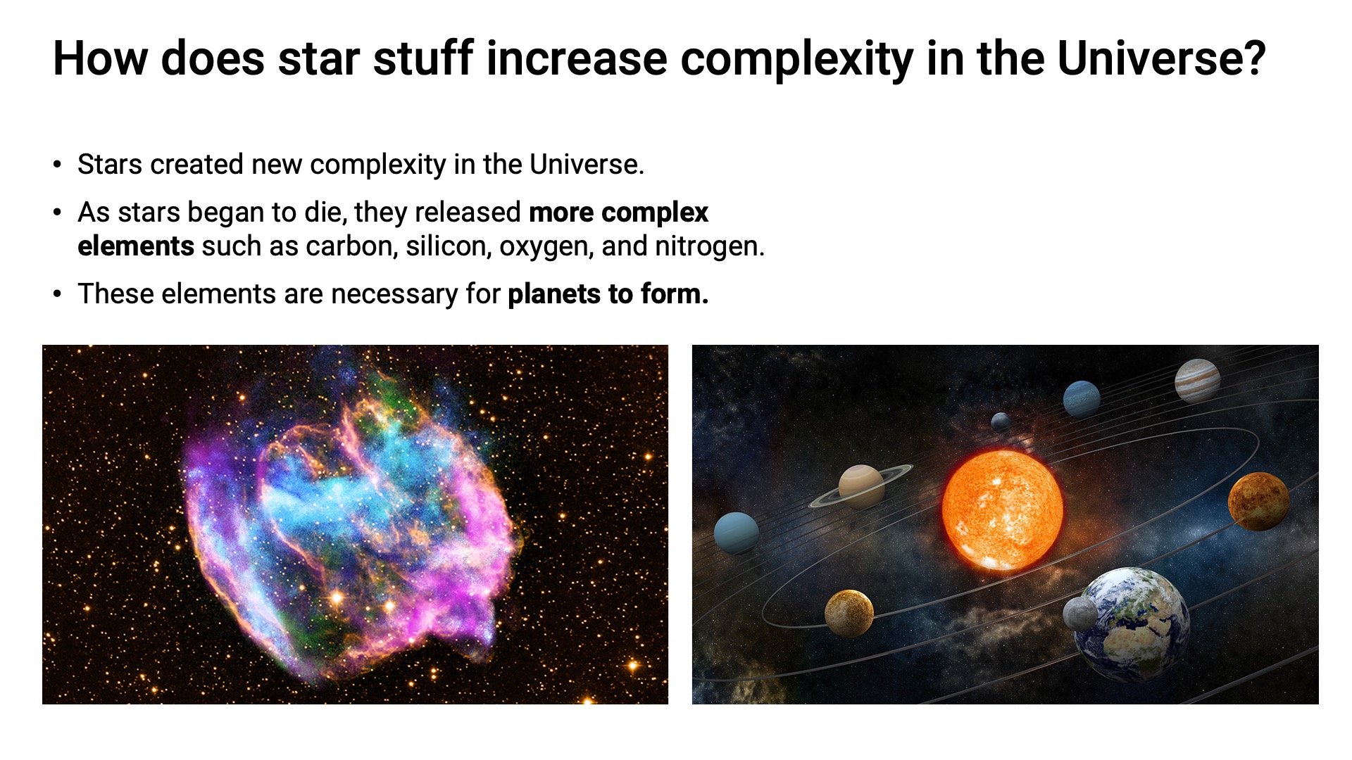 The birth of stars created new sources of light, energy, and complexity in the Universe. But they can’t live forever, right? New chemical elements exploded from dying stars, often in the form of huge supernovas that scattered these elements throughout the Universe.