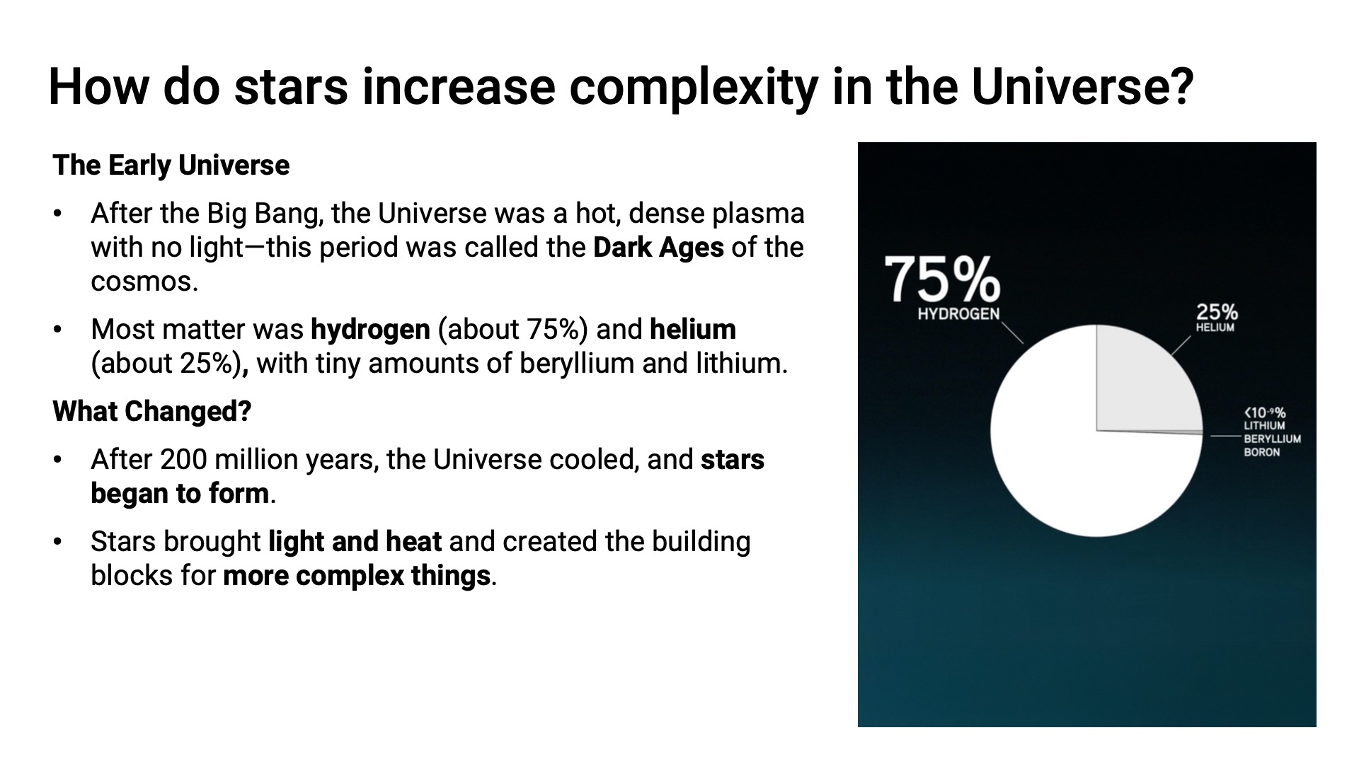 - Explain how stars created new complexity in the Universe.