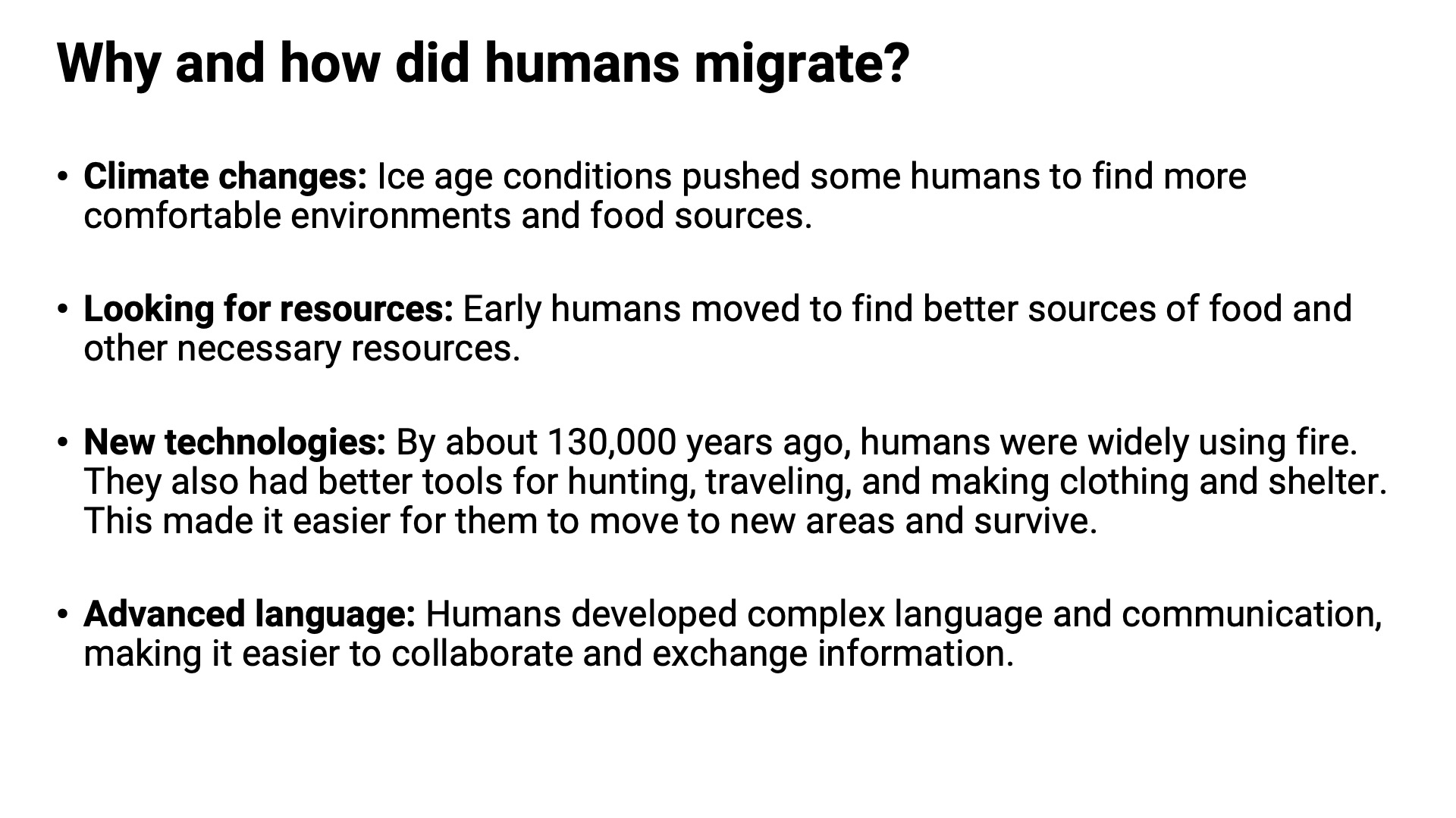 By the end of this unit, humans will have spread across the globe. Before we move on, let’s take one more close look at what caused this.