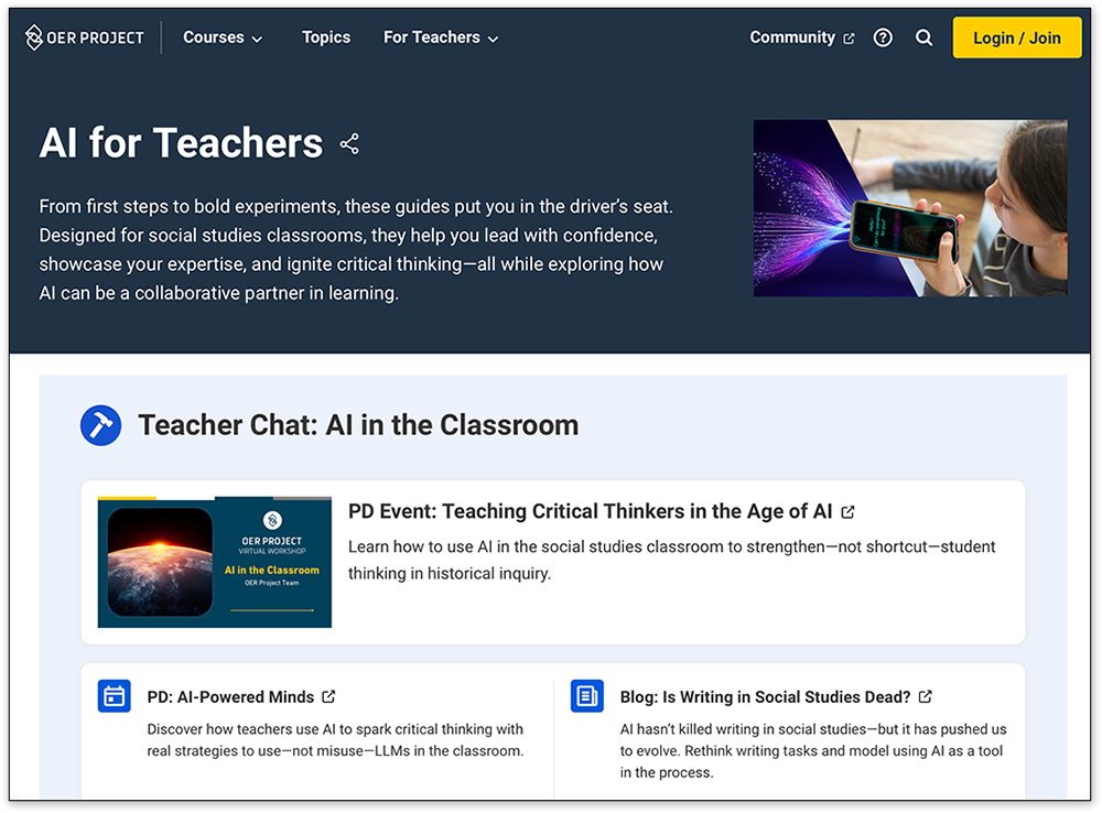What does this mean for your classroom? Don’t shy away from teaching historical thinking skills! These will help your students become critical users of AI tools while they develop the kinds of skills colleges and employers are looking for. From sourcing to contextualization to claim testing (and more!), OER Project offers a variety of resources—including a one-stop shop for incorporating AI into your classroom.